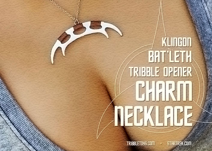 From the Klingon chef K’ulia K’uck — famous for such dishes as TRIBBLE tartar and TRIBBLE kabobs — comes the Klingon bat’leth TRIBBLE OPENER NECKLACE. These 3-inch charms are perfect for all your TRIBBLE skinning/cooking needs.