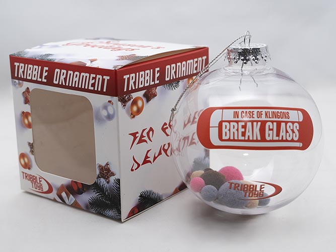 Protect your holiday season from Klingons with these adorable Christmas ornaments. Each clear plastic ball (4-inch diameter) contains a few miniature TRIBBLES visible inside, with signage that reads: “IN CASE OF KLINGONS BREAK GLASS”! Box included.